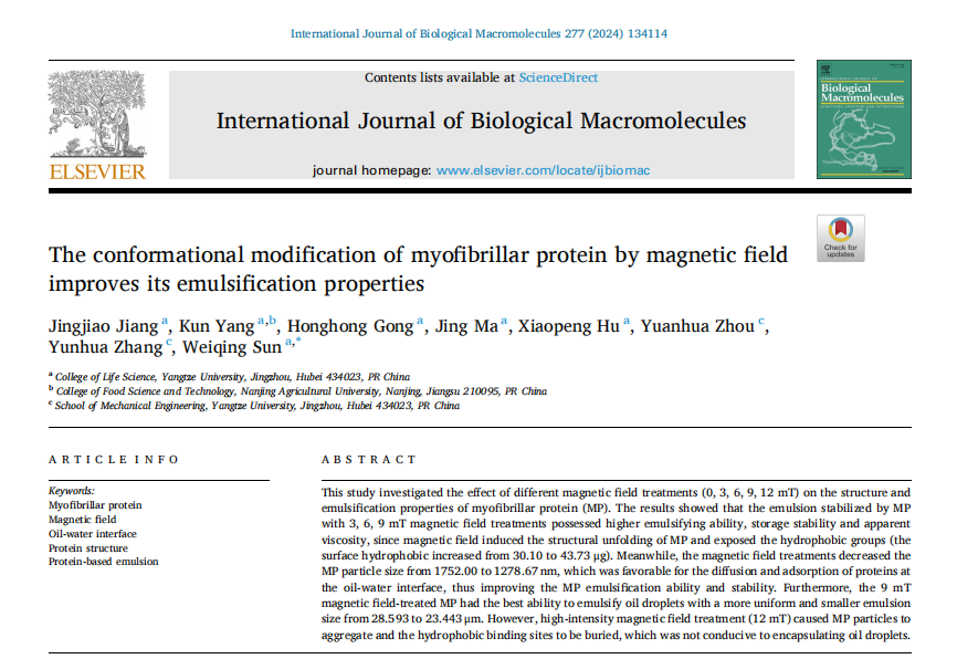孙卫青教授课题组在国际top期刊《International Journal of Biological Macromolecules》(中科院一区,IF:7.7)发表题为“The conformational modification of myofibrillar protein by magnetic field improves its emulsification properties(磁场对肌原纤维蛋白的构象修饰改善了其乳化特性)”的论文。论文第一作者为色情网