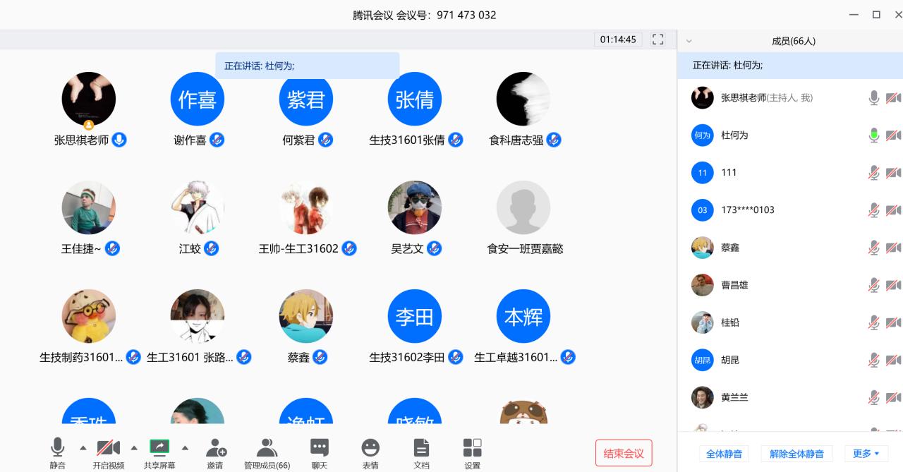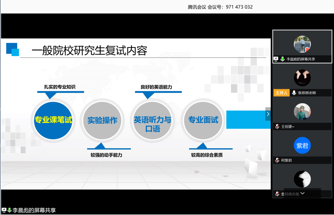 15级生物技术专业学生,现就读于武汉大学遗传学的何紫君学姐,依次为同学们分享自己的考研经验。三位同学结合自身经历从如何搜集复试信息、什么情况下考虑调剂以及复试中的专业课笔试、实验操作、英语听力与口语和专业面试如何准备等多个方面分别进行了详尽的讲解。接着谢书记提醒同学们要做好线上复试的硬件设施和软实力的准备,并且要注意防诈骗;杜院长则是从导师的角度出发提醒同学们复试面试时不要紧张、不要犯低级错误,要注意面试礼仪和精神面貌、要突出重点和个人优点。最后,同学们针对目前还存在的关于考研的疑问进行了提问,比如:调剂复试时间和原专业复试时间是否一致?初试成绩占总成绩的比例?如何在面试中做一个好的自我介绍?等等,学长学姐和老师们都一一予以了耐心的解答。
