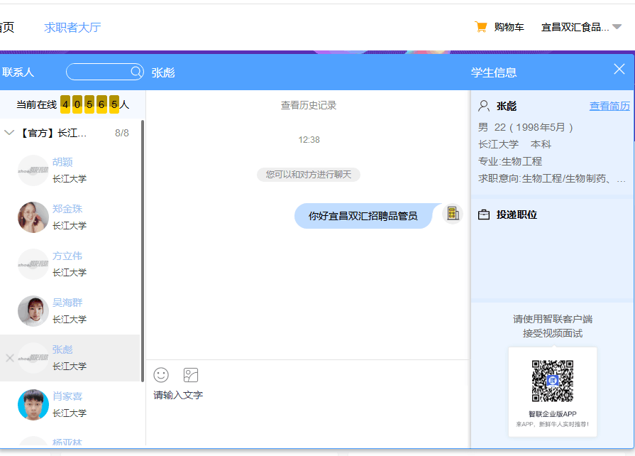 本次双选会从2月25日便开始组织宣传,与以往线下招聘会不同的是,学生和用人单位整个过程都是通过线上交流,并且流程上也有区别。2月25日至3月18日属于前期准备阶段,学生通过学生报名链接进行报名并投递简历,用人单位通过企业报名链接进行报名并发布职位,期间可以查看学生投递简历情况。3月19日9时至17时则是正式面试阶段,用人单位与学生通过该平台进行线上文字交流或视频面试。