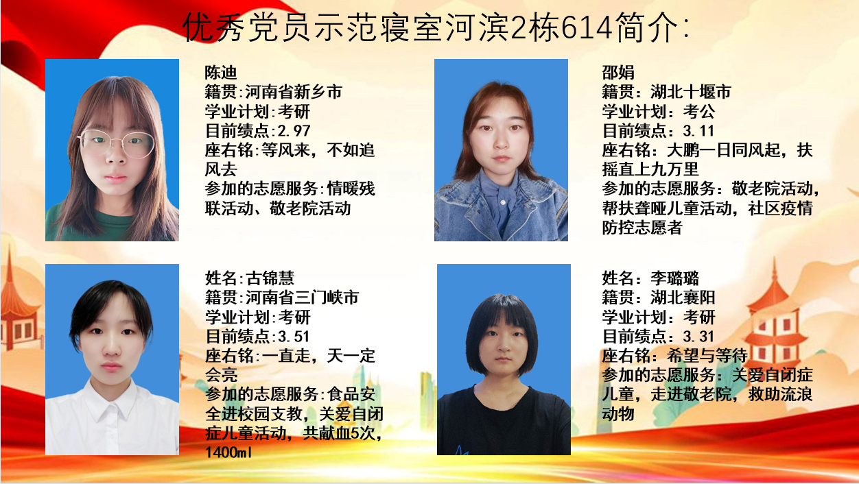 (通讯员 白旭红)为进一步发挥党员的先锋模范作用,敦促学生党员以自身形象和实际行动带动广大学生养成良好的行为习惯。经党员申报,支委讨论批准,色情网 本科生第二党支部党员古锦慧所在寝室河滨公寓2-614被评选为“党员示范寝室”。该寝室目前共产党员一名,发展对象一名,积极分子两名。