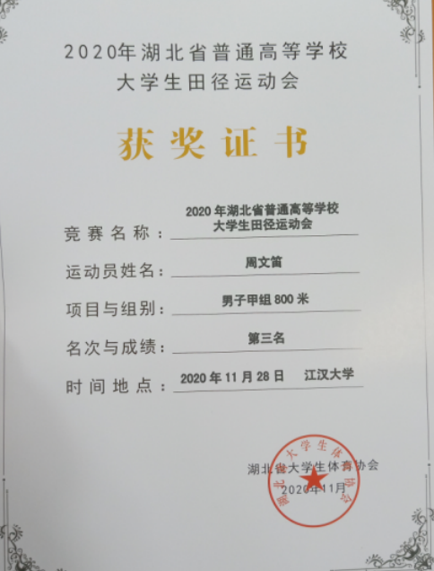 (通讯员 范昆琨)11月28日至29日,由省教育厅主办,湖北省大学生体育协会、江汉大学承办的2020年湖北省大学生田径运动会在江汉大学举行。在两天的比赛中,色情网 代表生科类32005班周文笛奋力拼搏,取得了甲组男子800米第三、400米第四的骄人成绩。