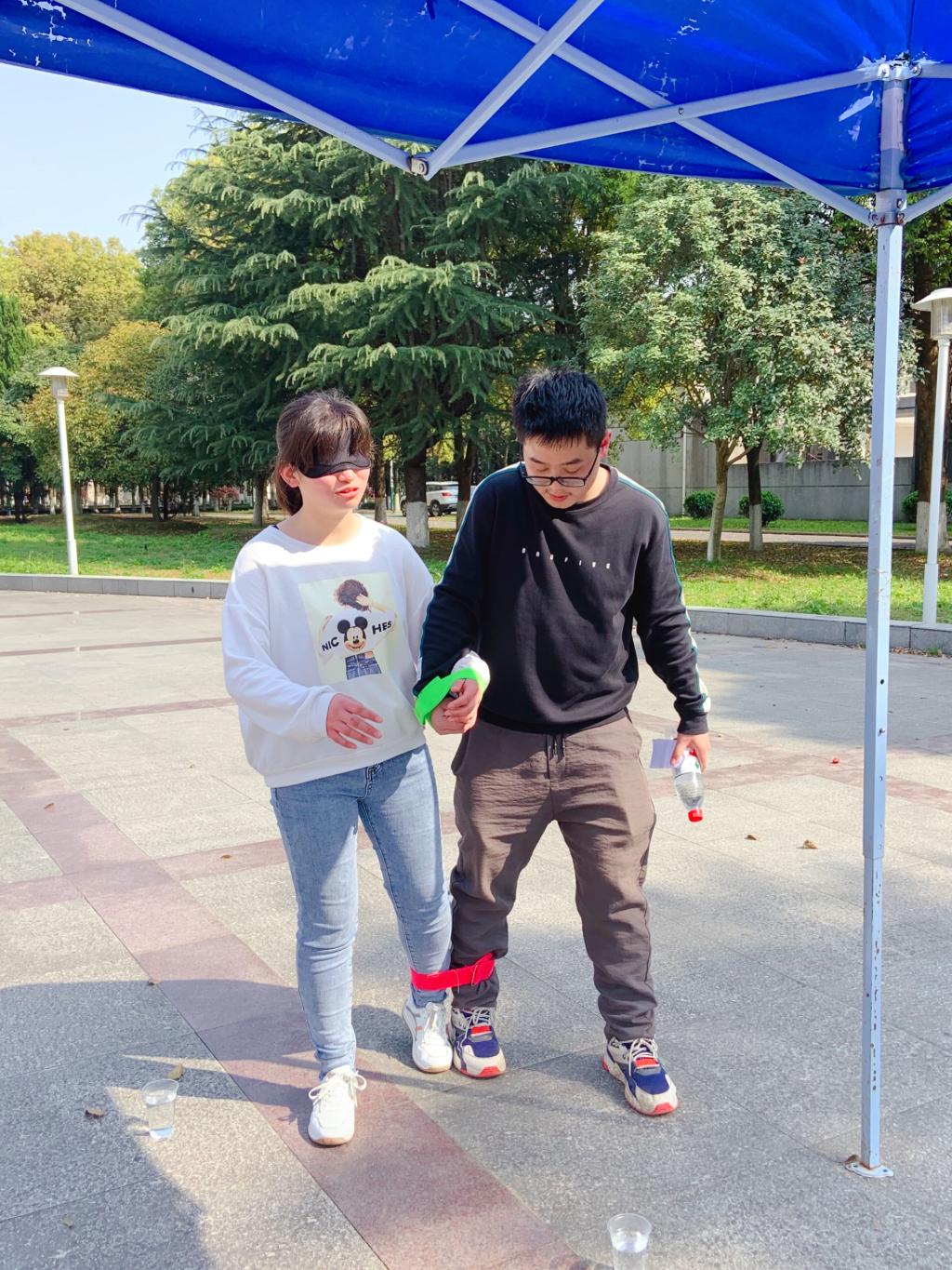 活动在主持人的一段致词中拉开帷幕。活动伊始,主持人向同学们介绍了活动的游戏规则:同学们先通过分组游戏两两分成一组,完成分组任务后,一组成员的其中一位同学在戴上眼罩的情况下由另一位同学指引寻找分布在校园各处的任务点,并完成指定任务,成功进行三轮游戏后,寻找角色转换点互换“盲人”与“拐杖”身份,继续进行下面的游戏,全部闯关成功即可回到集合地点进行抽奖活动。当游戏规则介绍完毕之后,各组成员相继出发。任务过程中,同组成员默契配合,不断挑战,成功完成各项任务。活动最后,团委学生会主席团成员为比赛获胜者颁发奖品,对所有齐心协力完成项目的同学表示鼓励和肯定,活动结束后全体参与人员合影留念。