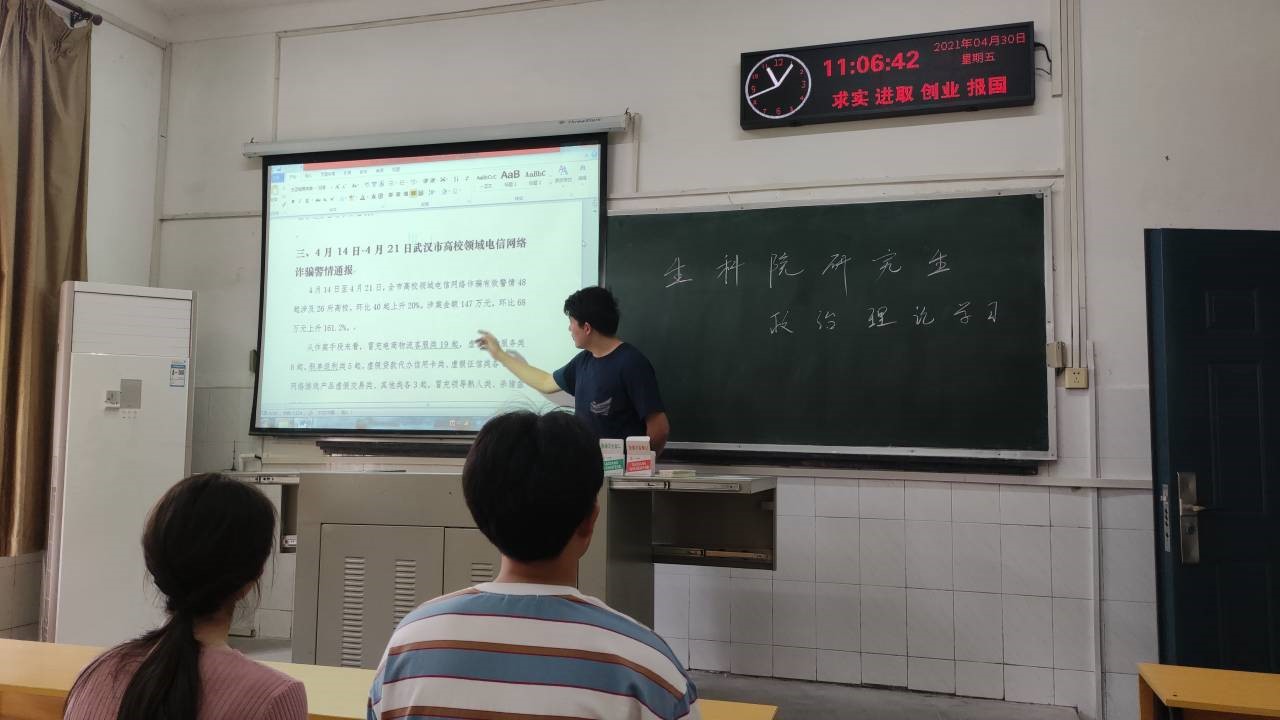 活动由研究生学生会主席迟荣烁主持,首先明确了本次活动的主题和中心思想,然后分别学习了以下文件:1.习近平总书记在清华大学考察时的重要讲话;2.习近平总书记对打击治理电信网络诈骗犯罪工作作出的重要指示;3.4月14日-4月21日武汉市高校领域电信网络诈骗警情通报;4.2021年“五一劳动节”假期安全教育;5.防溺水、运动安全、交通出行、饮食安全、防火防盗等方面安全知识学习。