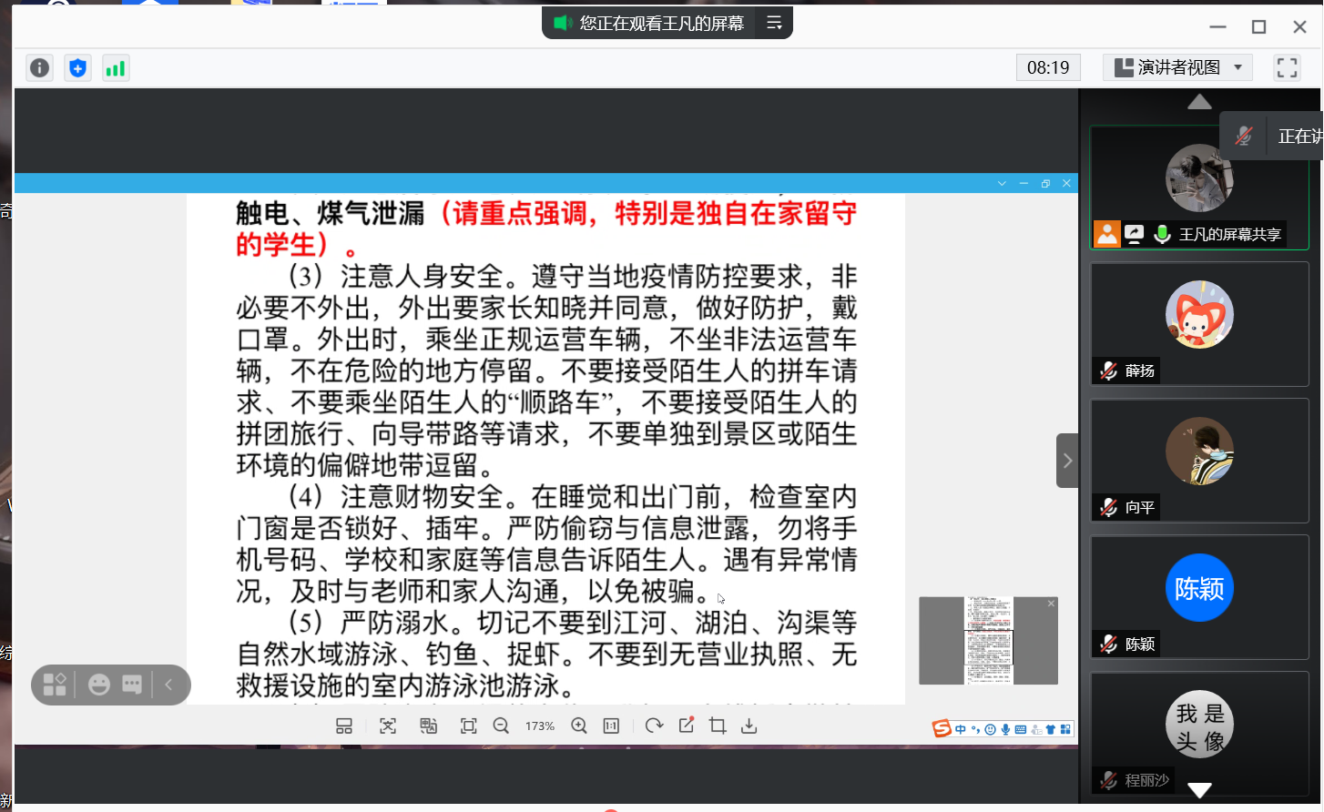 通过此次大会,提高了同学们的安全防范意识,进一步掌握“六防”安全知识与技能;提醒同学们在疫情防范期间培养良好的卫生习惯,尽量减少外出,外出时必戴口罩;每日坚持辅导猫打卡;相信同学们在暑假期间以及今后的生活中,能够提高危险防范意识,确保自身安全。