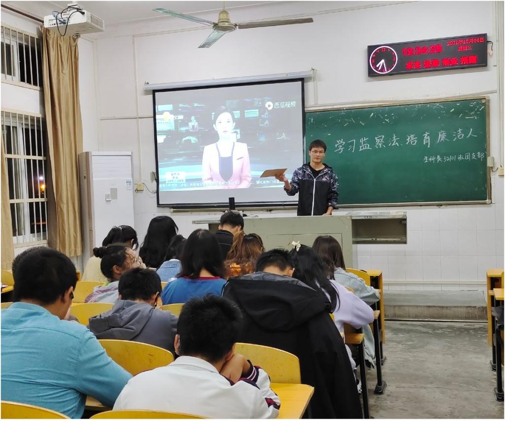组织各班级分班开展“学习监察法,培育廉洁人”主题班会和团日活动。主题班会和团日活动由各班团支部副书记主持,全体同学参加。