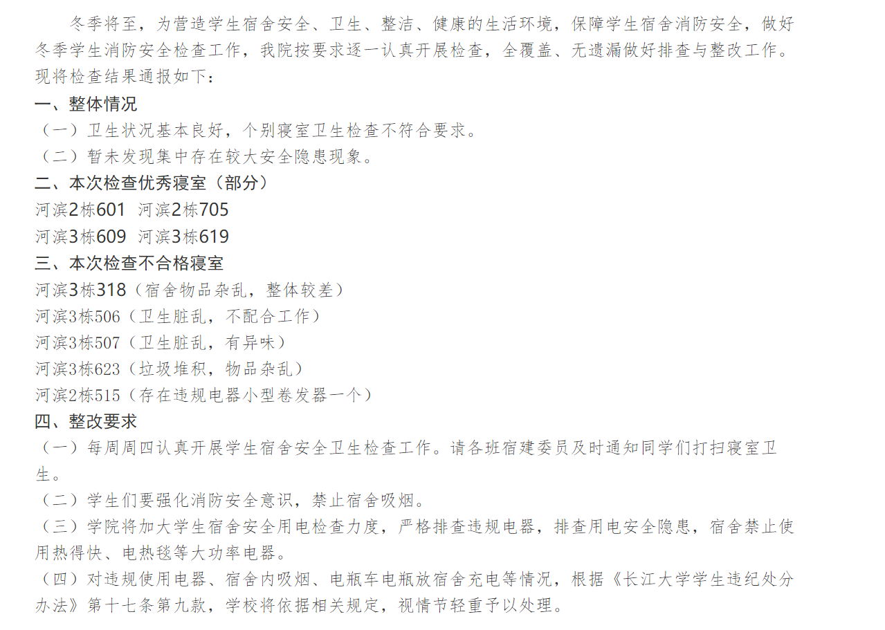 高度重视学生宿舍冬季消防安全隐患排查工作,党委副书记汪萍组织领导,各年级辅导员、主要学生干部深入学生寝室进行安全排查整改。此外,色情网