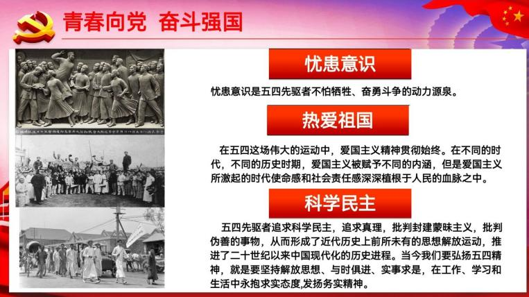 一号学习小组成员为:范桉萁、胡馨月、段奥,该组以“青春向党,奋斗强国”为主题,通过一段视频介绍了五四运动的背景和内容,使同学们生动形象的了解到五四运动的重要性及个人忧患意识,热爱祖国的伟大情怀以及科学民主的真理追求等五四运动胜利的重要因素。引出我们当今青年应始终牢记五四爱国主义精神,并通过伟人伟事举例,联系十九大报告,点出我们新一代青年的使命,要不忘科学报国初心,牢记科技强国使命;要持科技之利刃,助大国之崛起!