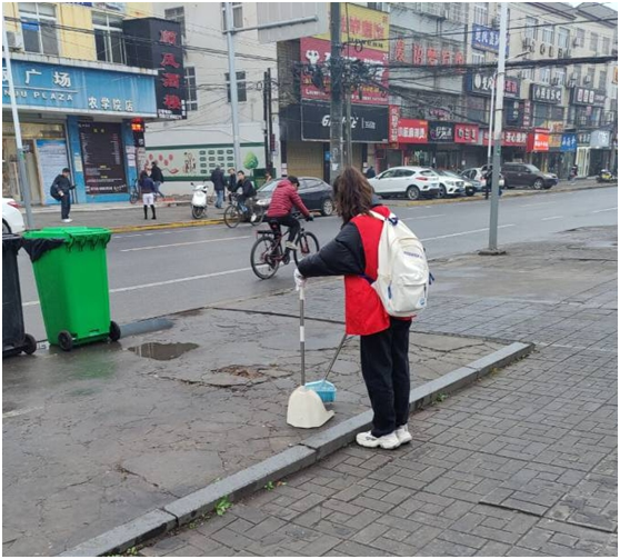 校门口集合,各自领取了马甲和手套、筷子、垃圾袋等清洁工具。划分组别和区域后,志愿者们来到了各自负责的区域,热情满满地展开了志愿服务工作。志愿者们开始清理街道,认真清扫草坪中和道路上的烟头、瓶盖、纸片和烧烤竹签等垃圾;下过雨后湿润的地面使得部分垃圾不易拾起,志愿者们果断放弃工具,用手去捡起垃圾;当看到自行车东倒西歪时,他们毫不犹豫上前将其罗列整齐,热心市民也会在一旁帮助志愿者并对志愿者们的工作表示肯定和鼓励。志愿者们在看到车主违章停车后,会及时地追上前去,文明礼貌地对车主违章停车的行为进行劝阻,车主也十分配合,知悉后便驾车离开。每一位志愿者在岗时都十分敬业,他们用自己的努力让街道变得更加干净整洁,让城市秩序变得更加有序。