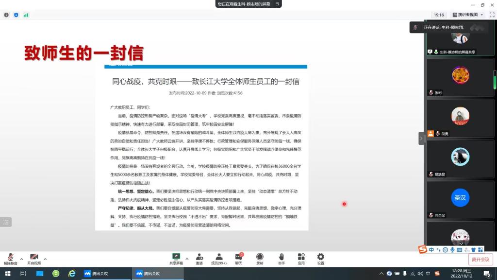 于2022年10月12日晚上召开了在校研究生疫情防控主题班会。本次会议由研究生辅导员顾志翔主持,色情网