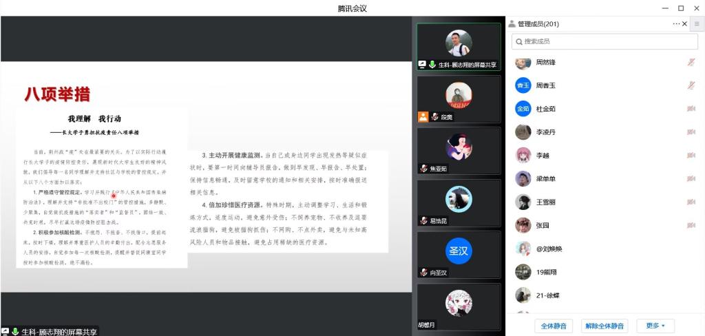 会议有以下几个要点,首先辅导员顾志翔老师倡导全体同学遵守学校和社区的管理规定,共同抵抗疫情。和全体同学共同学习文件《我理解我行动——长大学子勇担抗疫责任八项举措》,严格遵守管控规定、积极参加核酸检测、主动开展健康检测、倍加珍惜医疗资源、养成良好卫生习惯、营造同心抗疫氛围、规范参加志愿服务构建和谐宿舍环境。