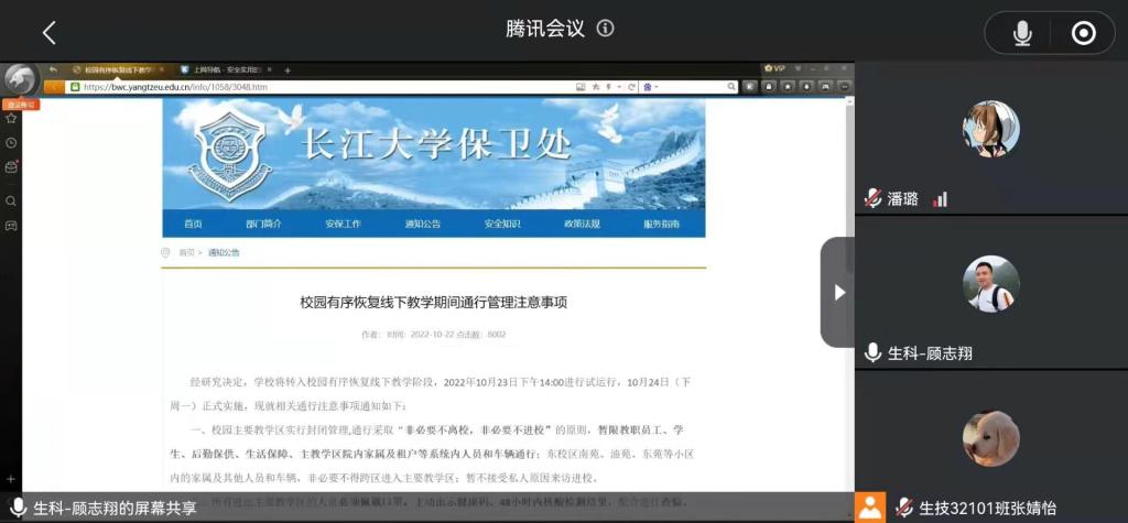 有序恢复线下教学学生管理方案”,表示目前疫情形势仍然严峻,仍需严格遵守“非必要不出校、非必要不离荆”政策。在此之后,顾老师针对同学们提出的疫情之下的生活问题进行了一一解答。