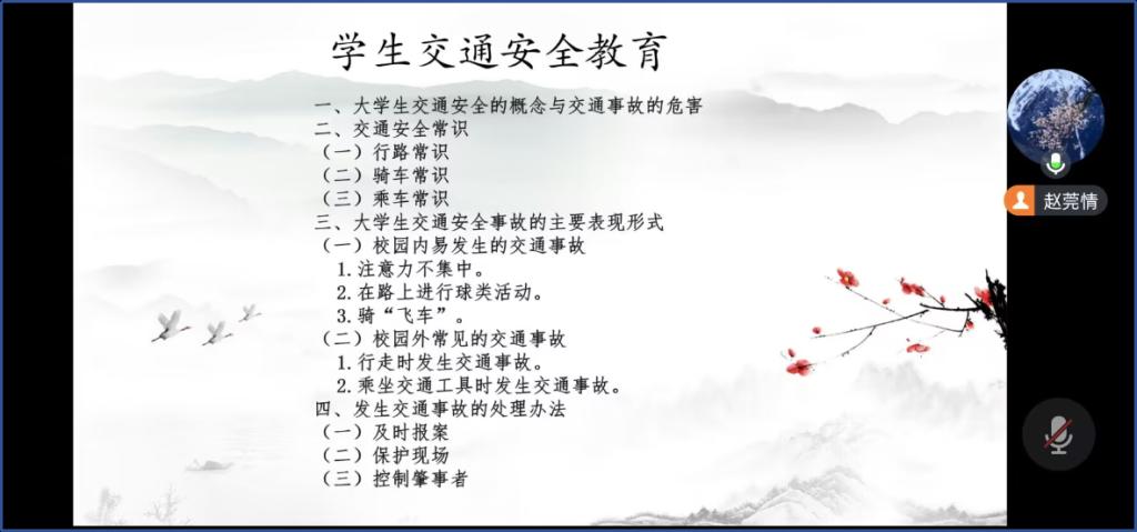 班会上,辅导员们通过普及交通安全常识和交通安全法规、分享交通事故典型案例以及发生交通事故的处理办法,引导学生们互动讨论等形式,让同学们深刻认识交通安全的重要性。帮助学生们牢牢树立“安全出行,文明交通”的思维理念,自觉遵守交通法规,维护交通秩序,真正做到一名遵法、守法、懂法的大学生。