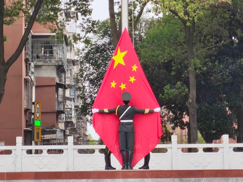 首先,国旗护卫队迈着铿锵步伐登场。接着,在激昂的《义勇军进行曲》中,国旗缓缓升至旗杆顶端,现场师生齐声高唱国歌,激荡出强烈的民族自豪感,表达了对国家的崇高敬意。