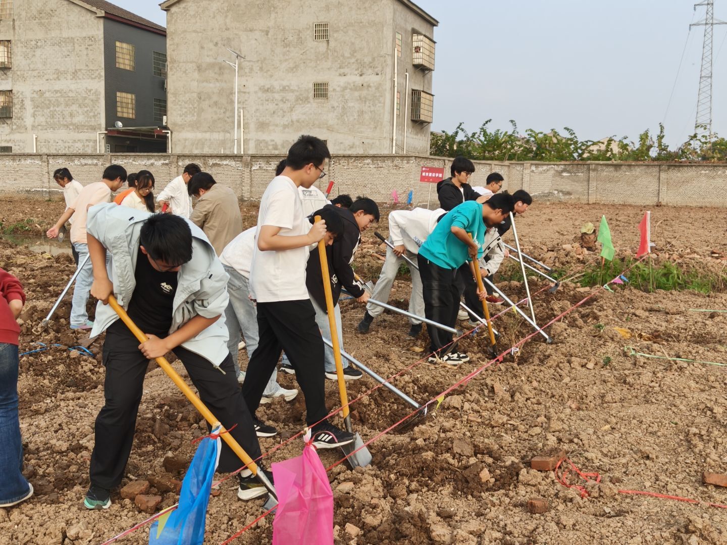 仪式结束后,在学院领导的带领下,各班班委(即劳动先锋团成员)作为首批学员参加劳动。学院团委书记李敏为学员们详细讲解本次劳动教育实践活动的具体任务、分组安排、安全注意事项及后续评比方式。在活动过程中,领导和老师们也深入田间,亲身示范,耐心指导,丈量、翻土、整地、认识农具……田埂间,同学们三五成群,分工协作。有人手持卷尺仔细丈量,划分责任地块;有人俯身捡拾散落土中的砖块与树根,为耕种清理出整洁的土地;还有人挥动铁锹,沿着田边挖掘排水沟渠。阳光下,铁锹与泥土碰撞的声音、同学们的交流声与笑声交织在一起,勾勒出一幅生动而热烈的劳动画卷。