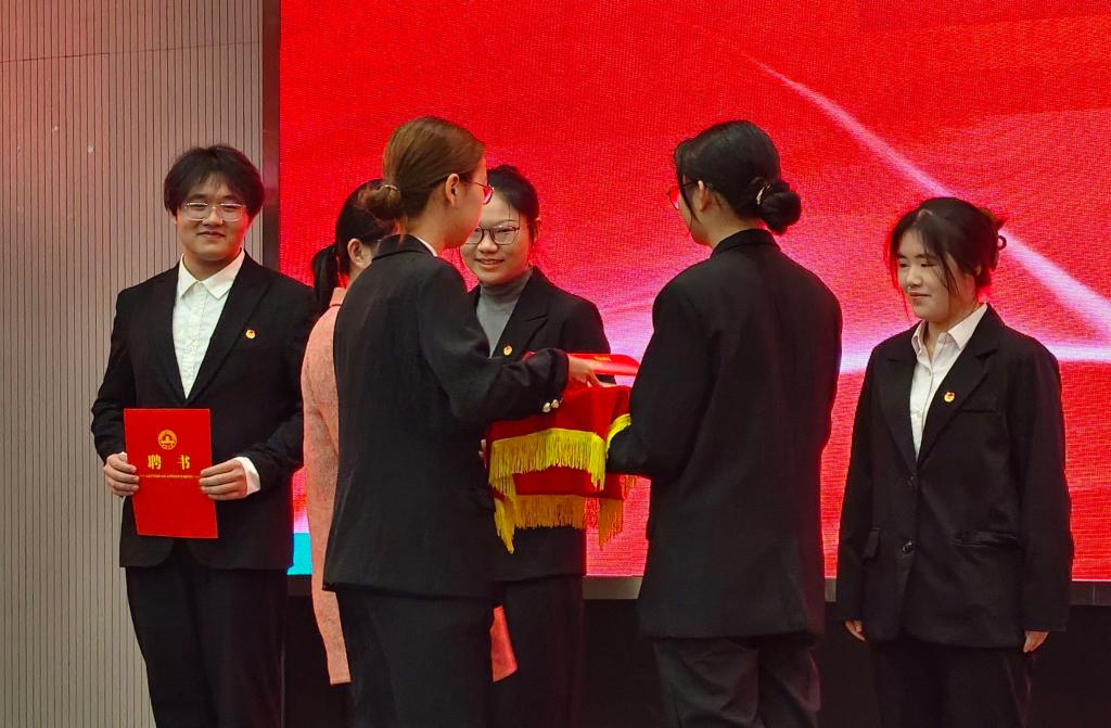 大会在庄严的国歌声中开始。学院老师为各部门负责人及主席团成员颁发聘书,激励大家恪尽职守、勇于担当。
