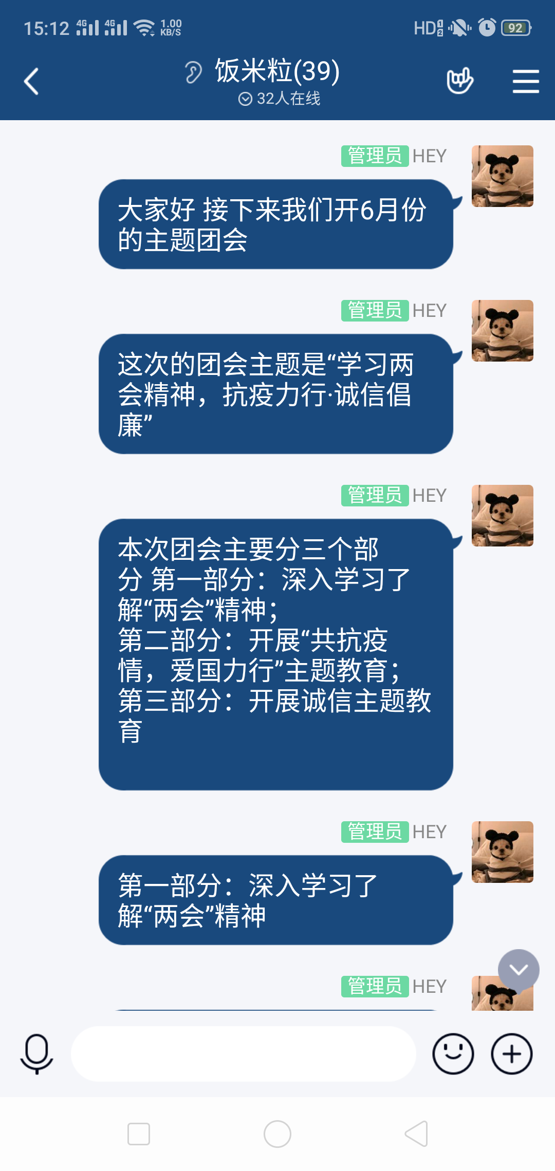 (通讯员 温远东)“学习两会精神,抗疫力行,诚信倡廉”,6月15日下午3时,生技制药31801团支部进一步学习两会精神,共同探讨如何发挥专业优势,传播健康理念,宣传防疫知识。线上会议由副团支书周岚主持。