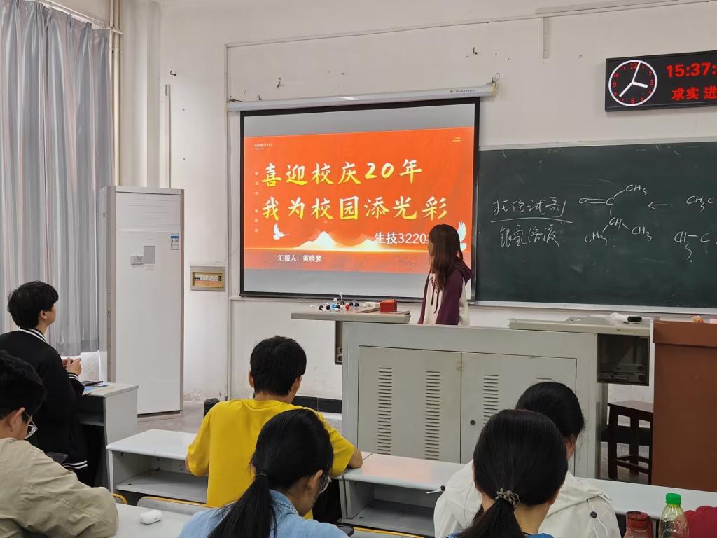 合并组建20周年工作,团支部副书记黄晓梦带领同学们展开“喜迎校庆20年,我为校园添光彩”主题班会。学习校情校史,营造校庆氛围;熟悉校庆安排,融入主题活动;提升文明素养,展现良好形象。