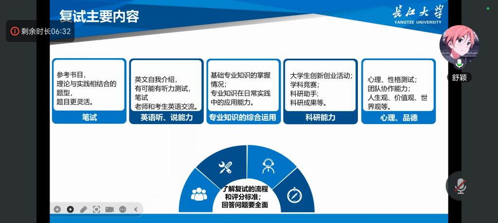 培训会上,万波介绍了学院考研复试指导工作安排。副院长李真顺做考研复试指导。她围绕复试的目的、复试前的准备、复试内容、面试准备、调剂注意事项等五方面进行了系统指导。她强调,要高度重视中英文自我介绍、专业基础复习、科研成果梳理等;要调整心态、谦虚自信、量力而行,平稳上岸。在答疑互动环节,在场老师认真回答同学们提出的问题,提供解决方案。