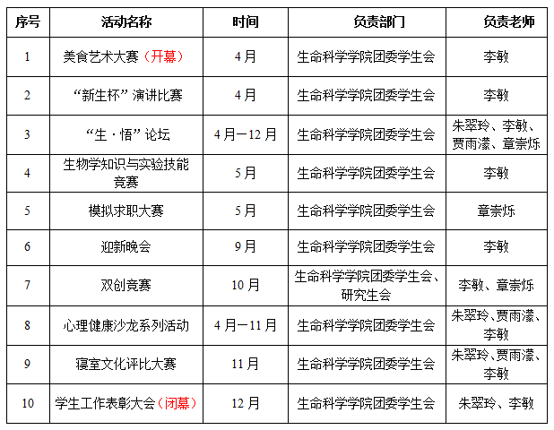 首届星空文化节将举办美食艺术大赛、“新生杯”演讲比赛、“生·悟”论坛、生物学知识与实验技能竞赛、模拟求职大赛、双创竞赛、宿舍文化评比大赛、心理健康沙龙、迎新晚会、学生工作表彰大会等系列活动。(具体活动安排见附件)