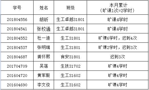 课堂考勤实施办法》,经学工办研究决定,对本月累计旷课4学时及以上、迟到2次及以上同学予以通报批评: