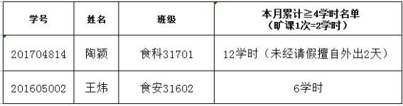 课堂考勤实施办法》,经学工办研究决定,对本月累计旷课4学时以上同学予以通报批评:
